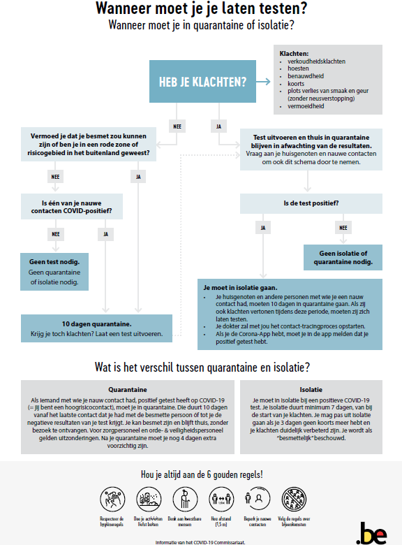 Heb je wél symptomen bel dan naar de dokter. You may only leave the house to get tested. Is de uitslag negatief. Als de mensen in quarantaine een positieve COVID-19 test krijgen tijdens de quarantaine is moeten ze in quarantaine blijven tot drie dagen na het verdwijnen van de symptomen.